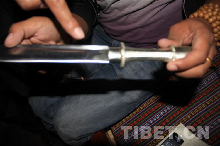 圖為老伯向記者解釋普通藏刀和“拉孜藏刀”的區(qū)別,攝于2012年。2009年,西藏日喀則拉孜縣農(nóng)民次旦旺加被國(guó)家文化部認(rèn)定為非物質(zhì)文化遺產(chǎn)項(xiàng)目藏族金屬鍛造技藝代表性傳承人。攝影:夏炎