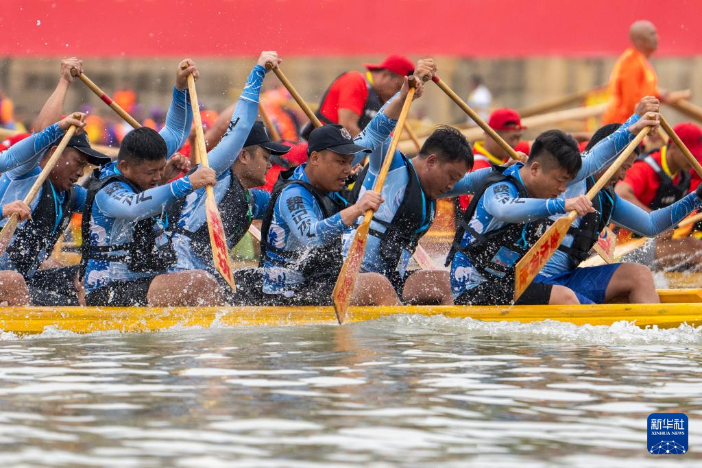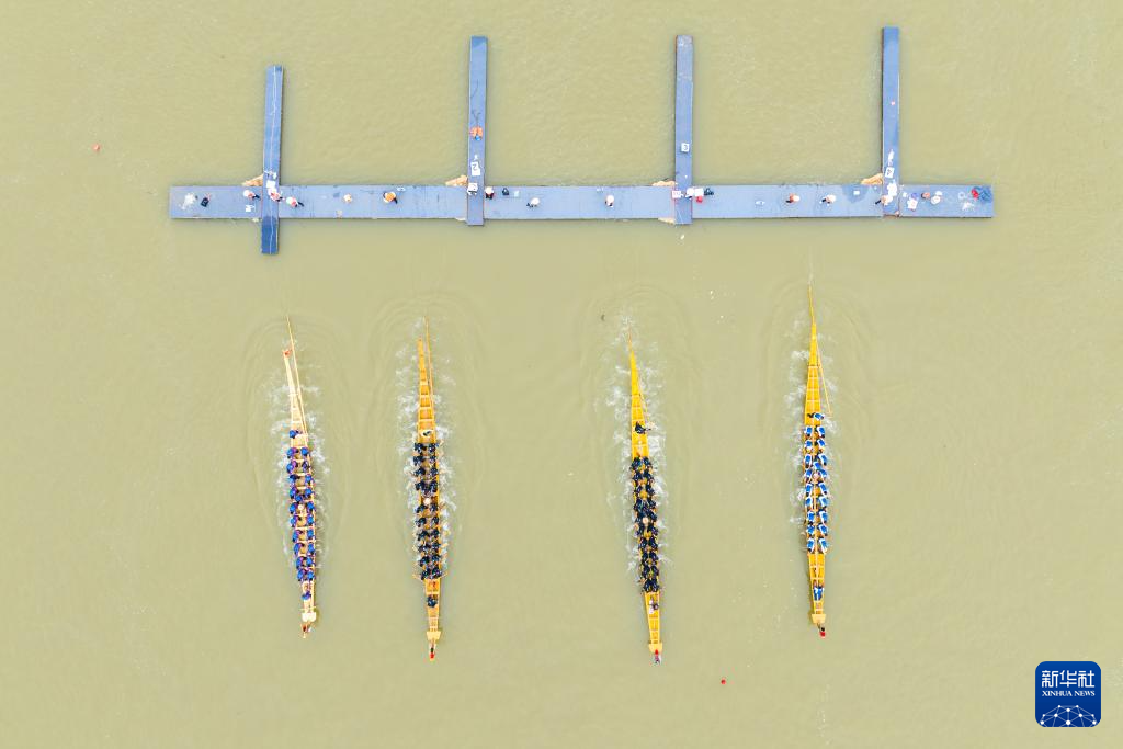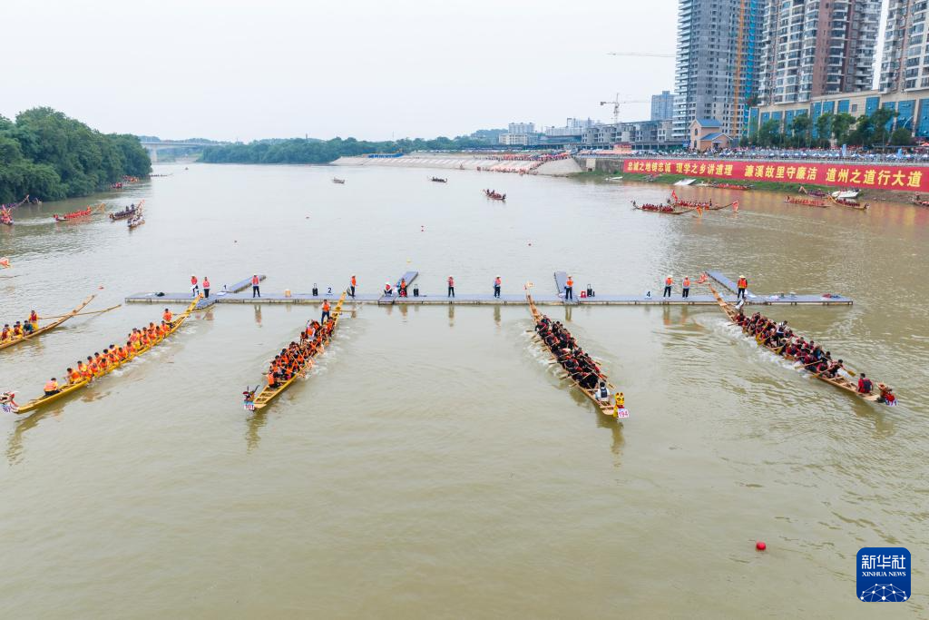 當(dāng)日,“國(guó)家非遺道州龍船傳統(tǒng)賽”在湖南永州道縣瀟水河水域開(kāi)賽,吸引了當(dāng)?shù)亟?00支龍舟隊(duì)5000余人同臺(tái)競(jìng)技,奮楫競(jìng)渡,迎接端午節(jié)的到來(lái)。