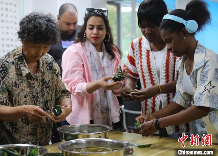 5月27日,在河北省秦皇島市海港區(qū)白塔嶺街道燕大西苑社區(qū),當地外國留學生相聚一堂,通過包粽子、體驗木版年畫等方式,沉浸式體驗中華文化的魅力。