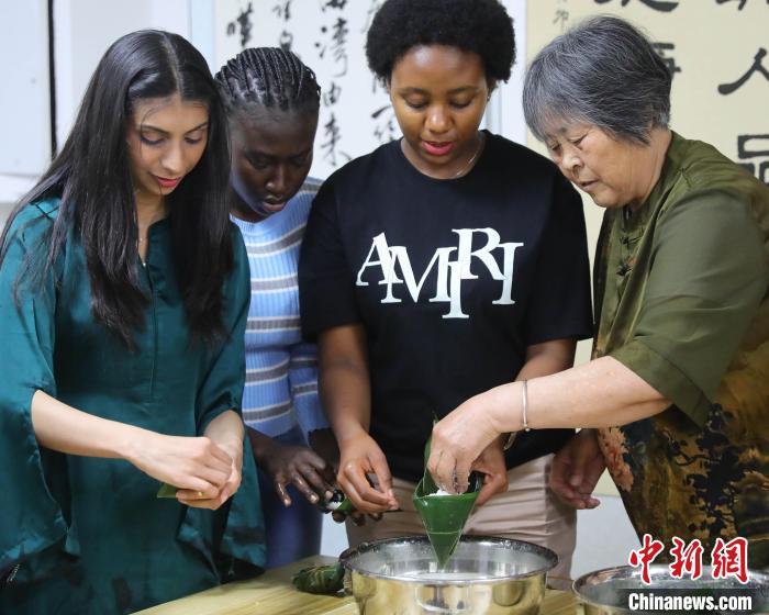 圖為社區(qū)居民指導外國留學生包粽子。曹建雄 攝