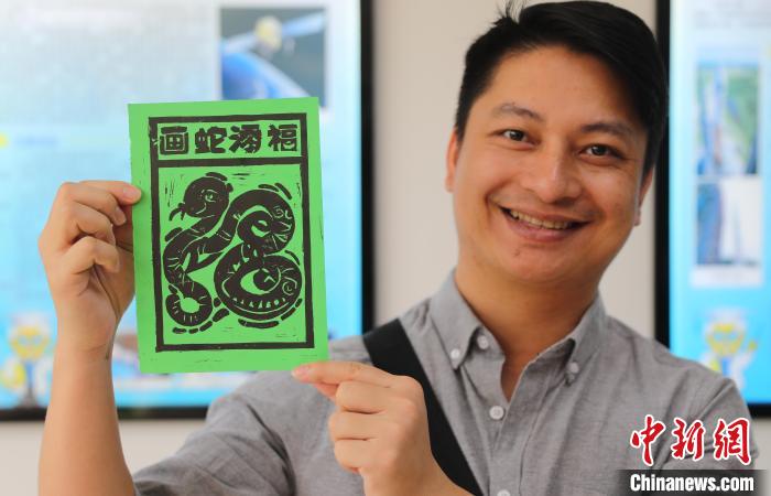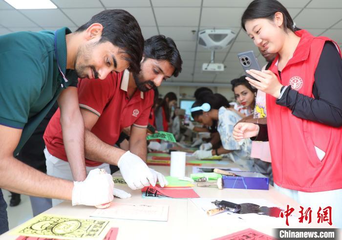 圖為外國留學生體驗木版年畫。曹建雄 攝