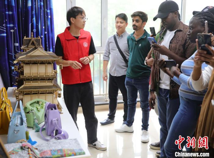 圖為志愿者帶領外國留學生參觀工藝品。曹建雄 攝