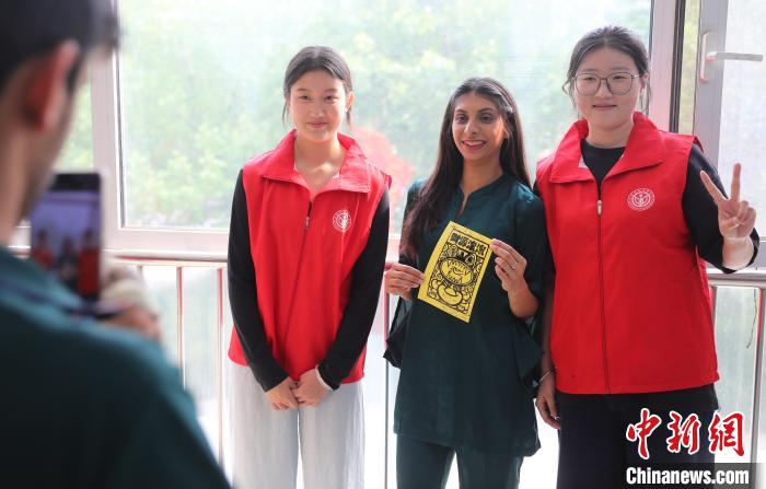 圖為外國留學生持作品與志愿者合影留念。曹建雄 攝