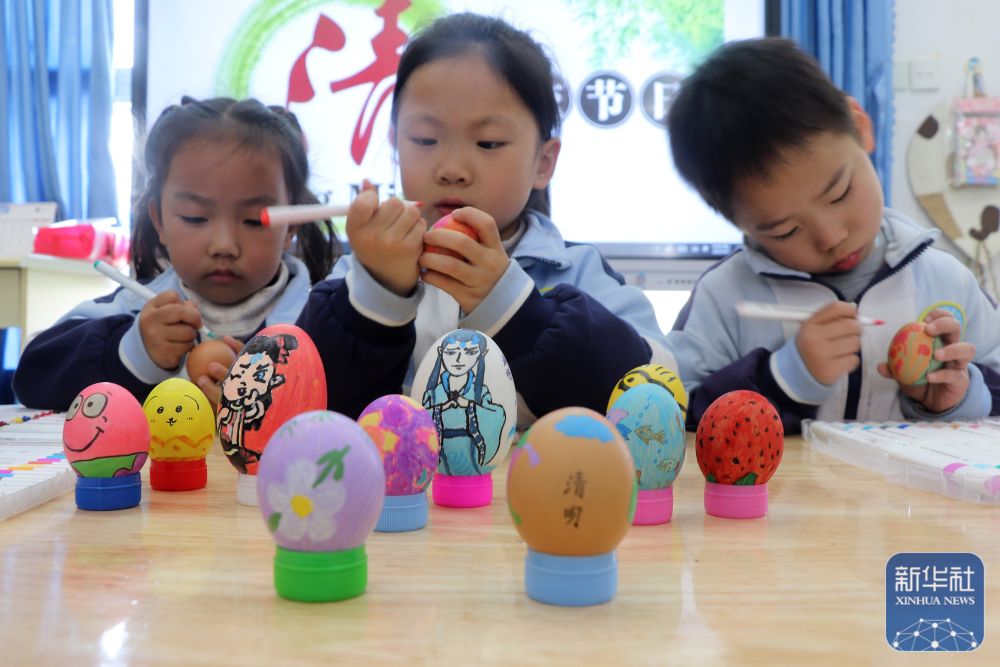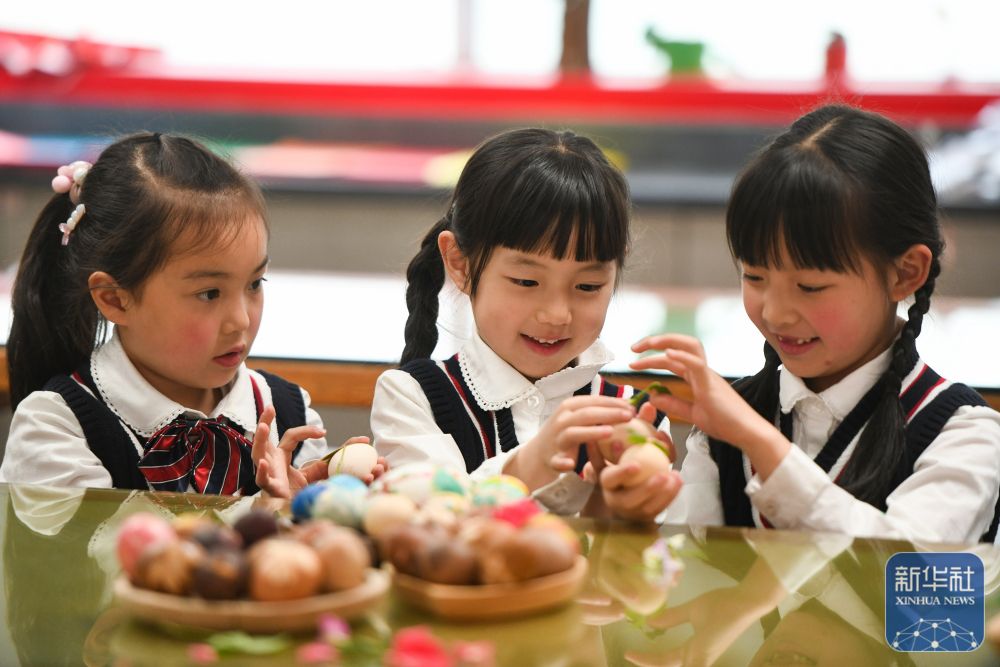 ↑ 4月3日,在浙江省金華市婺城小學(xué),小學(xué)生在制作清明花草蛋。新華社發(fā)(時(shí)寬兵攝)