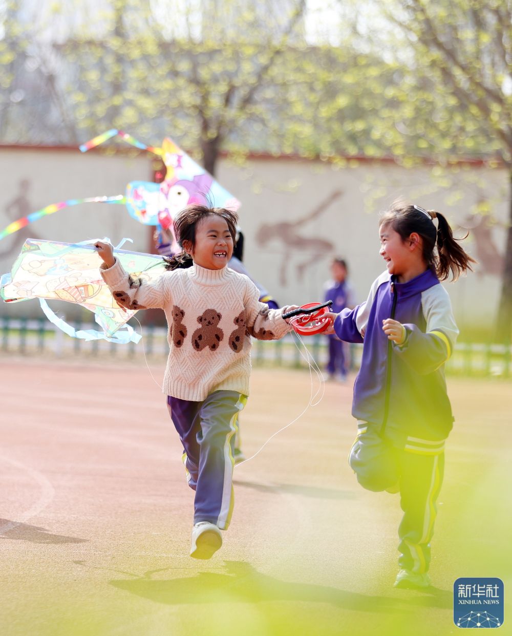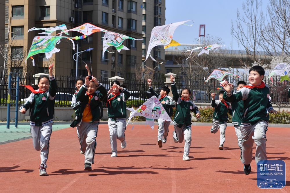 ↑ 4月3日,山東省臨沂市郯城縣第一實(shí)驗(yàn)小學(xué)學(xué)生在操場(chǎng)上放風(fēng)箏。新華社發(fā)(張春雷攝)