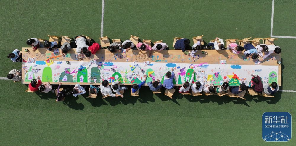 ↑ 4月3日,山東省鄒平市高新街道中心幼兒園的小朋友在繪制清明長(zhǎng)卷(無(wú)人機(jī)照片)。新華社發(fā)(董乃德攝)