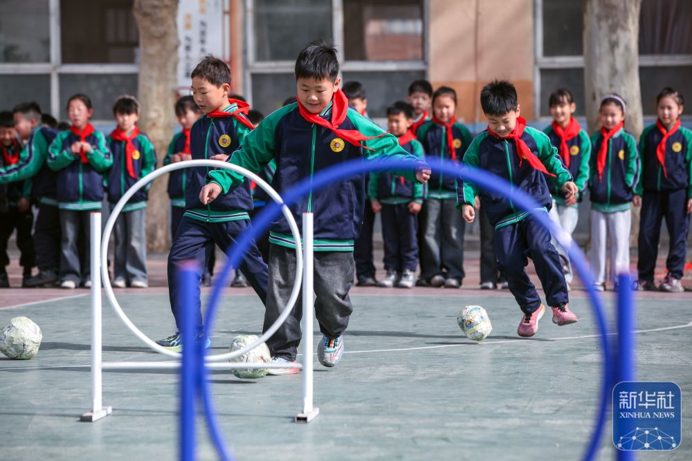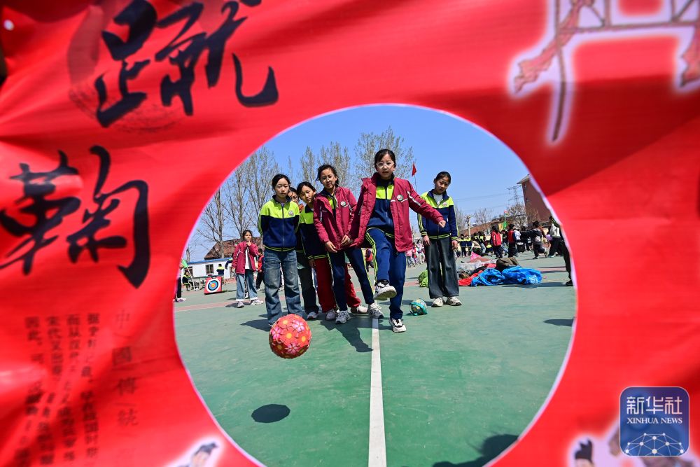 ↑ 4月3日,在河南省焦作市博愛(ài)縣清化鎮(zhèn)街道七街小學(xué),學(xué)生們?cè)隗w驗(yàn)蹴鞠。新華社發(fā)(程全攝)