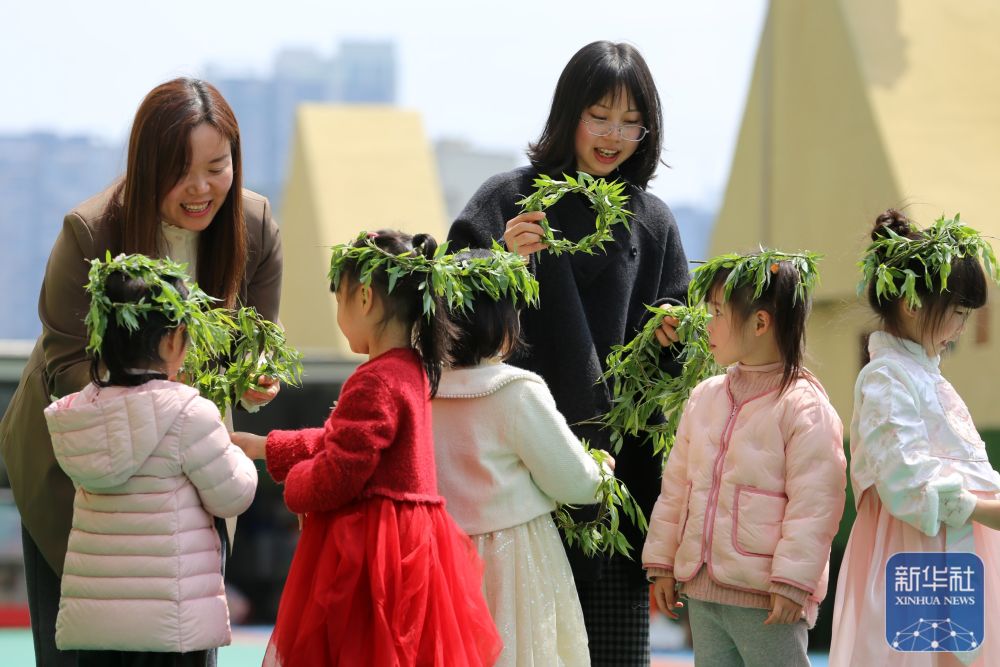 ↑ 4月3日,四川省樂(lè)山市瑞錦幼兒園小朋友和老師一起制作柳帽。新華社發(fā)(李華時(shí)攝)