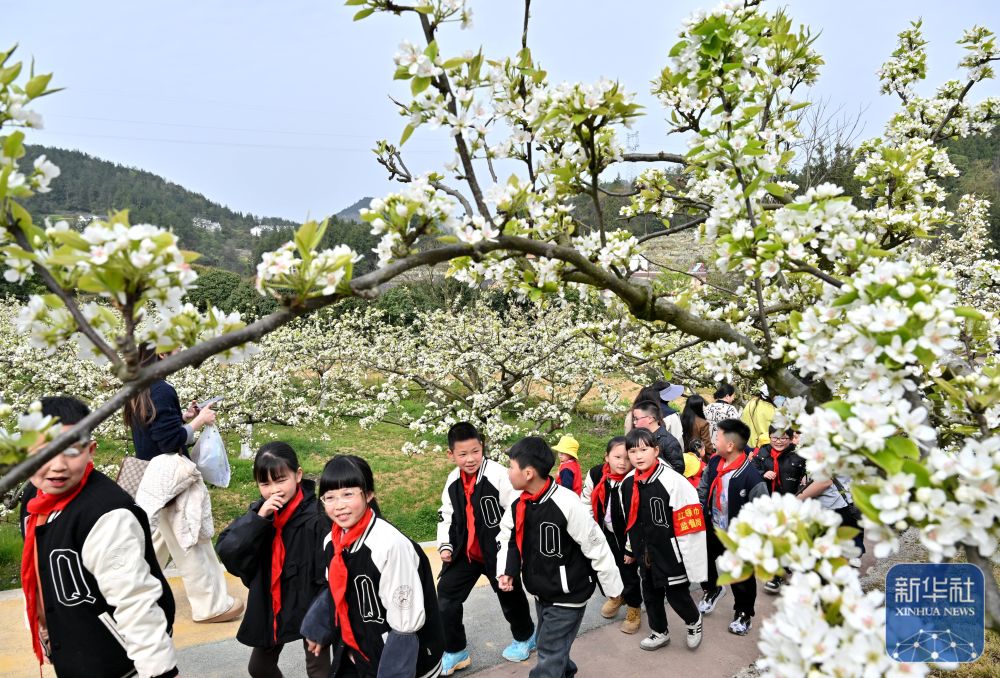 ↑ 4月2日,湖北省宣恩縣清江外國(guó)語(yǔ)學(xué)校的師生在黃坪村的梨園里徒步。新華社發(fā)(宋文攝)