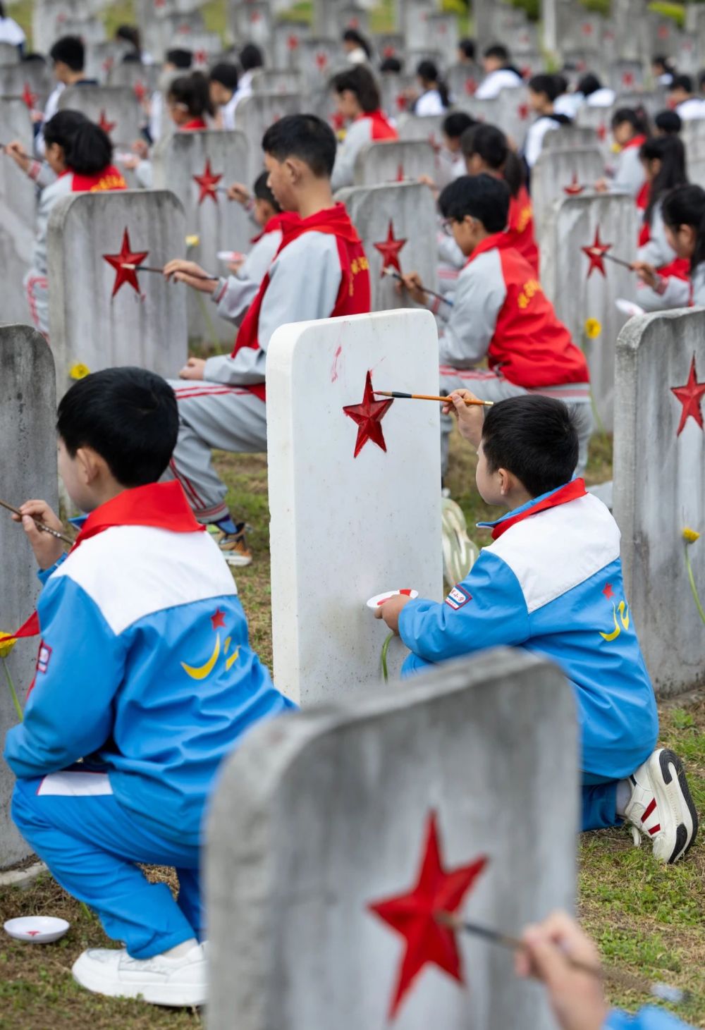 3月31日,在川陜革命根據(jù)地紅軍烈士陵園,通江縣沙溪初級中學和沙溪鎮(zhèn)中心小學的學生們一筆一畫地為無名烈士碑身上的五角星描紅。新華每日電訊記者江宏景攝