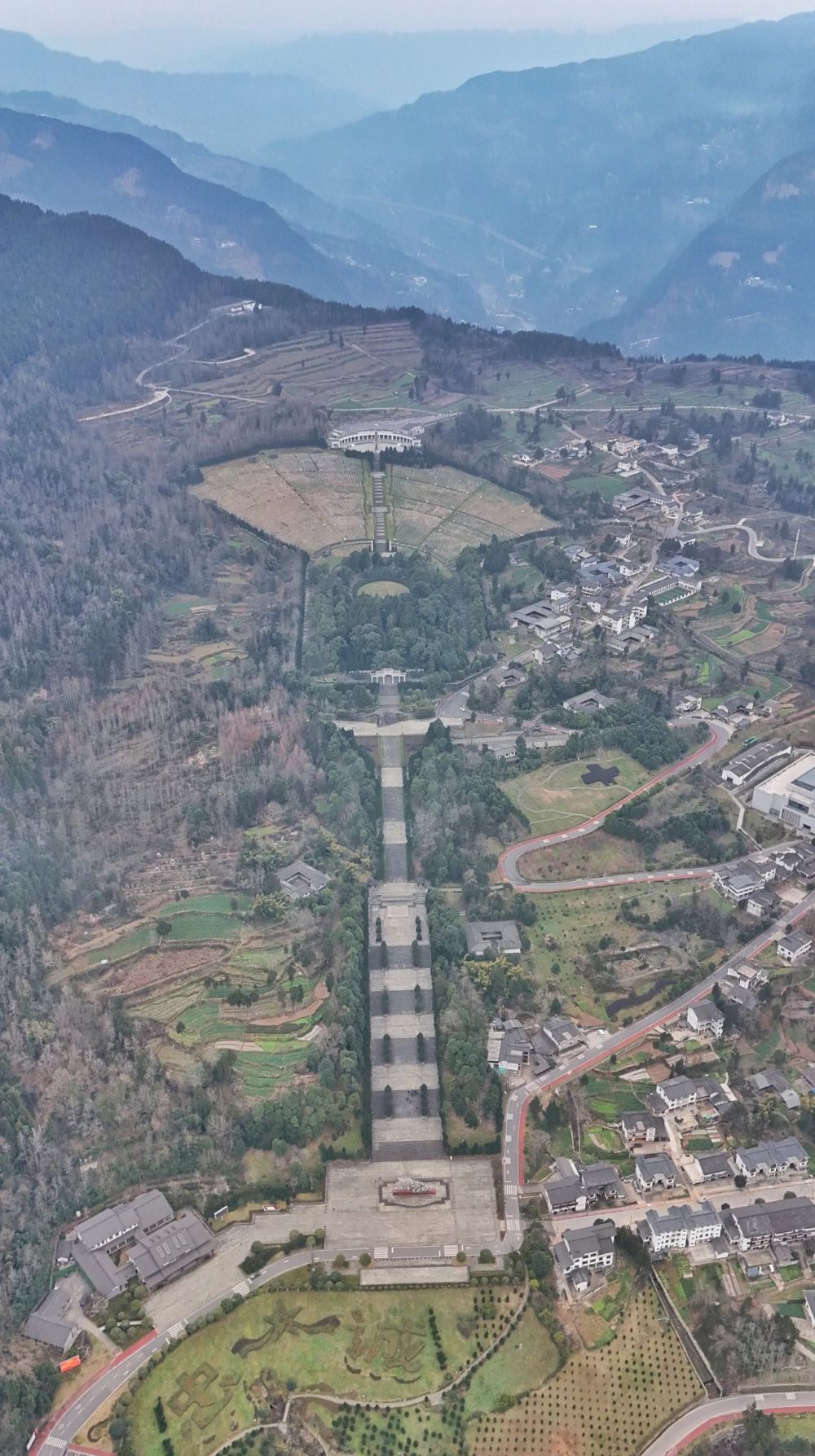 陵園依山就勢而建,沙溪河蜿蜒環(huán)繞,從空中俯瞰如一把火炬鑲嵌在青山綠水間。“火炬柄”是被稱為“千秋大道”的341級臺階,“火炬身”是核心墓區(qū),呈扇形分布的無名烈士陵園區(qū)則猶如熊熊火焰。