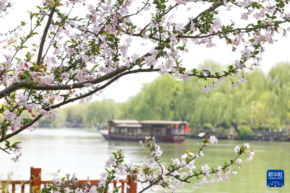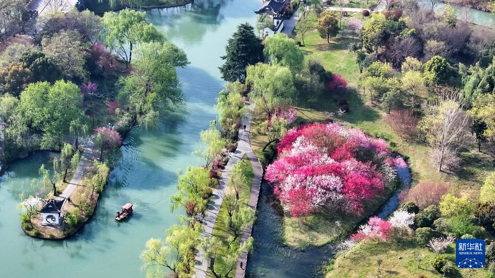 4月2日,游人在江蘇揚州瘦西湖風景區(qū)踏春賞景(無人機照片)。