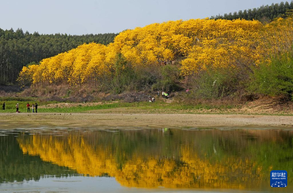 4月1日,在廣西柳州市融水苗族自治縣融水鎮(zhèn)興賢村,黃花風鈴木黃花綻放,吸引游客前來賞花游玩。