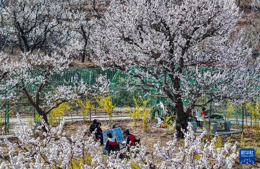 4月1日,河北省遵化市高級中學學生在遵化市南山常樂谷景區(qū)杏樹下寫生(無人機照片)。