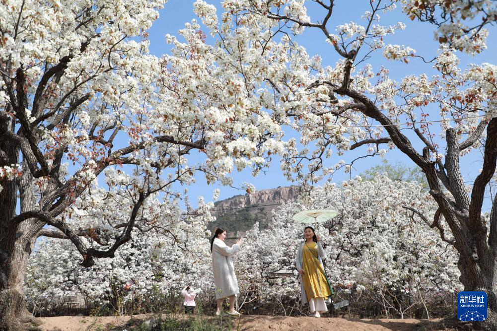 4月2日,傳統(tǒng)服飾愛好者在河北省石家莊市趙縣謝莊鎮(zhèn)梨果生產(chǎn)基地觀光拍照。