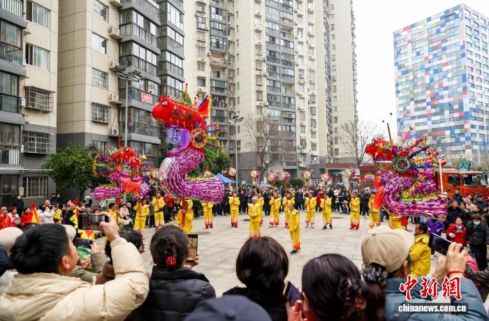 2月27日,湖北武漢,國家級非遺漢陽高龍走進社區(qū)進行表演,以傳統(tǒng)民俗為居民送上馬年元宵祝福。圖為高龍隊隊員們?yōu)榫用襁M行表演。中新社記者 張暢 攝