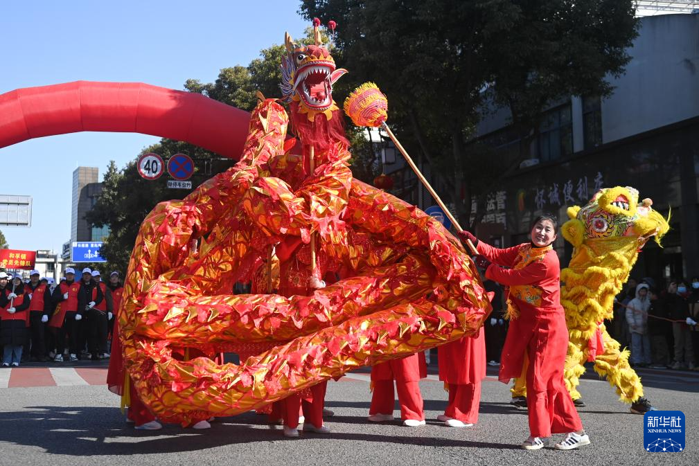 2月8日,鄉(xiāng)村女子舞龍隊在南潯區(qū)和孚鎮(zhèn)街區(qū)表演。