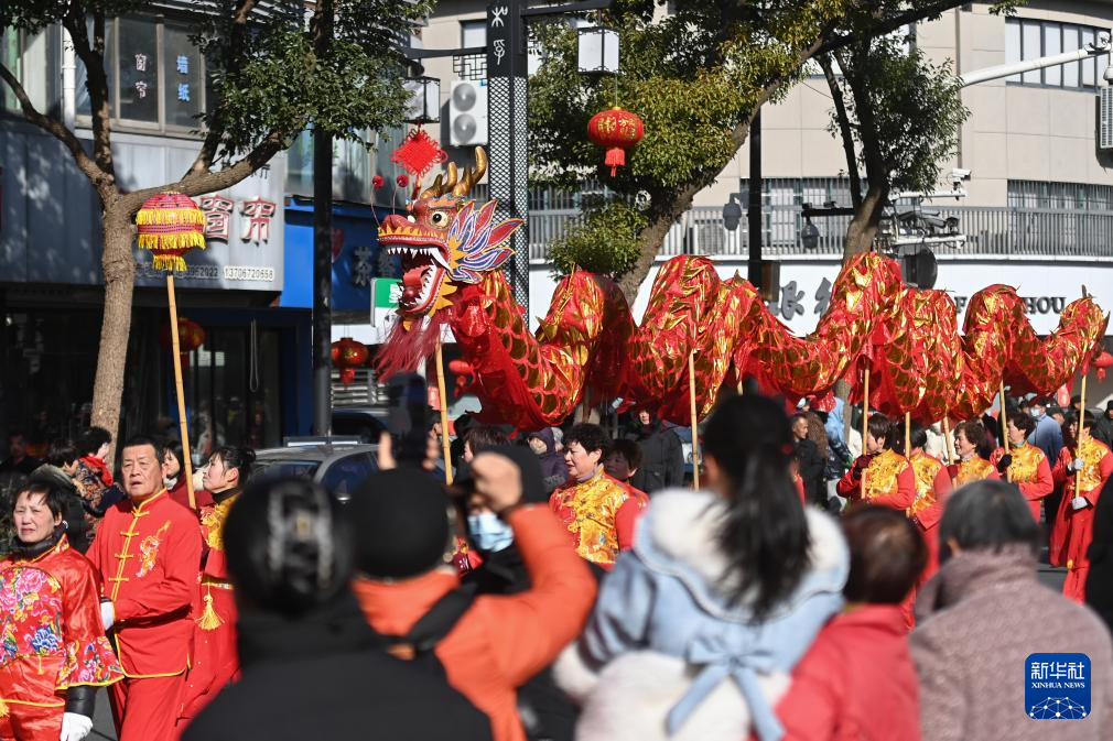 2月8日,舞龍隊在南潯區(qū)和孚鎮(zhèn)街區(qū)巡游。
