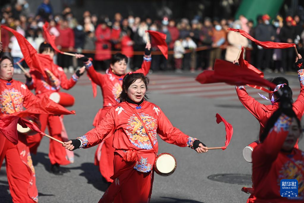 2月8日,鄉(xiāng)村女子腰鼓隊在南潯區(qū)和孚鎮(zhèn)街區(qū)巡游表演。