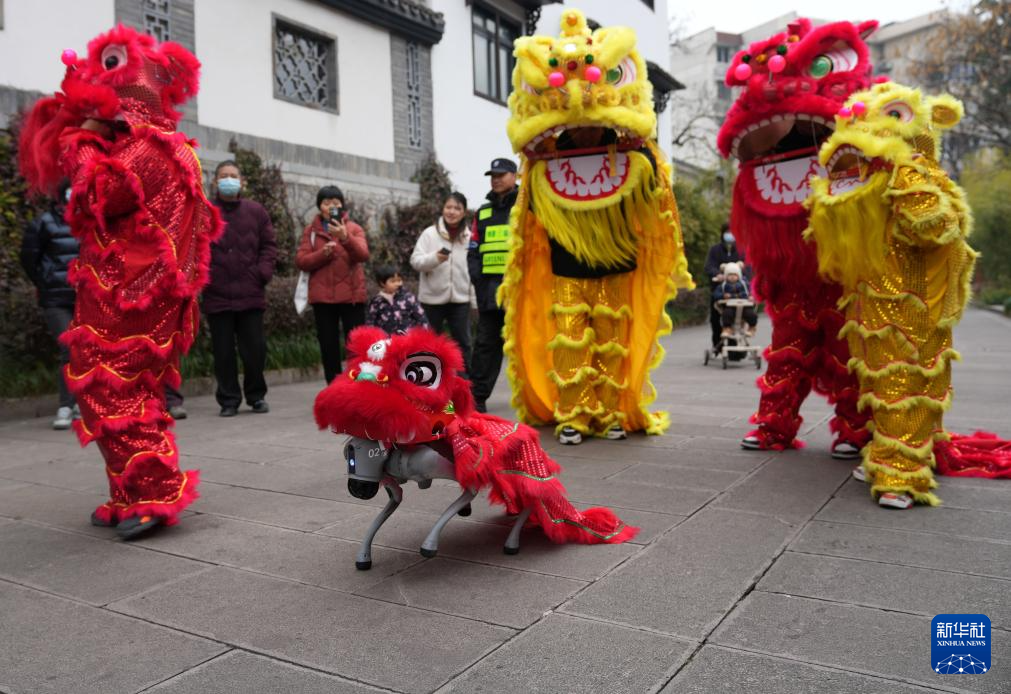 2月11日,在浙江杭州市西湖區(qū)北山街道元宵文化廟會活動中,機器狗與演員一起為社區(qū)居民進行舞獅表演。
