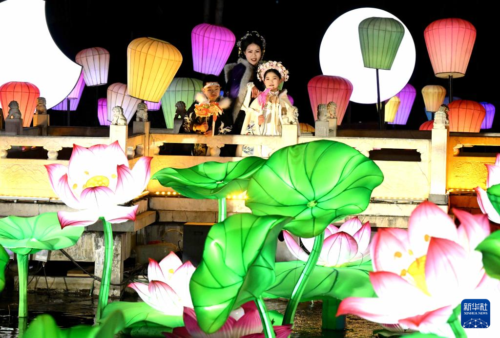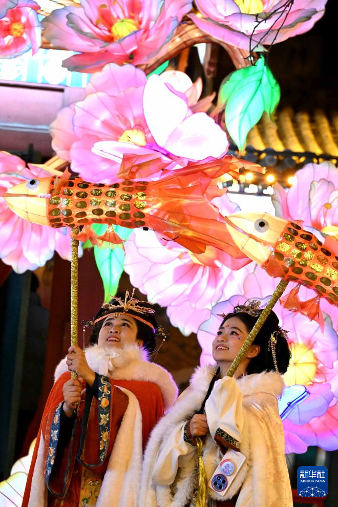 2月8日晚,身著傳統(tǒng)服飾的游人在河北省石家莊市正定榮國府影視基地內(nèi)游園賞花燈。