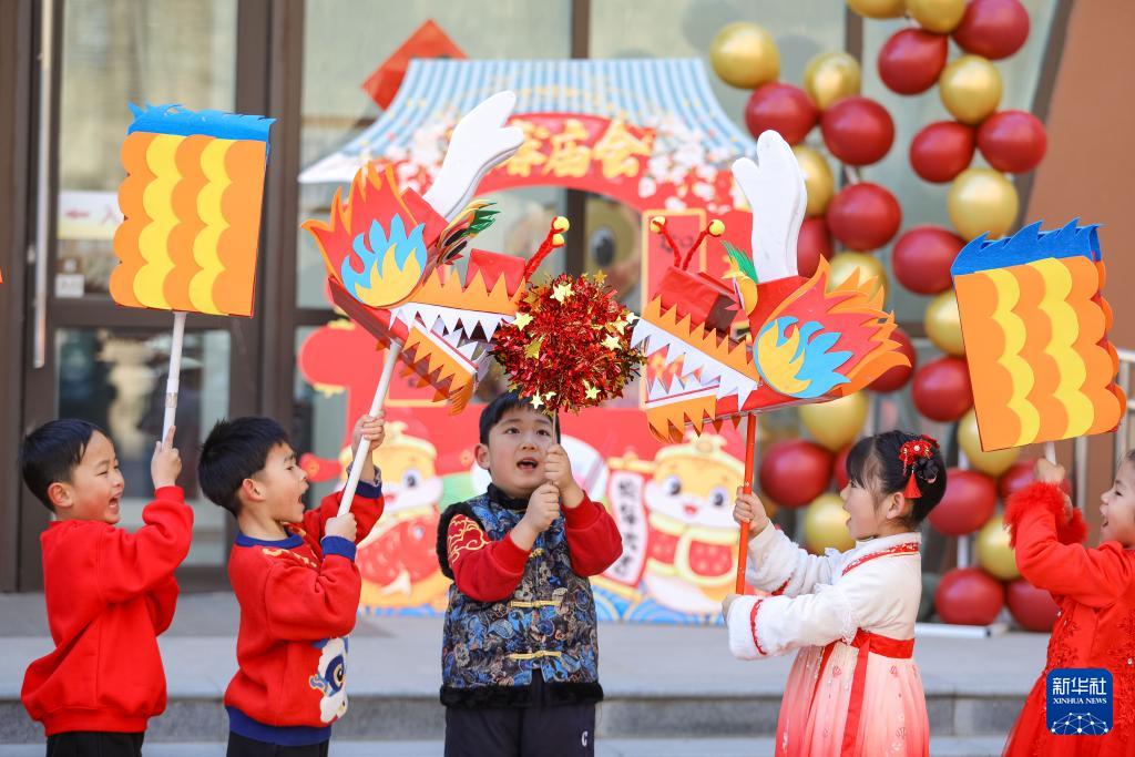 2月10日,小朋友在山東省青島市李滄區(qū)九水東路幼兒園開展的民俗活動中進行舞龍表演。