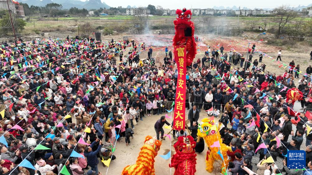2月9日,廣西柳州市柳江區(qū)進德鎮(zhèn)四連村土垢屯,村民在客家“上燈節(jié)”活動上進行舞獅表演(無人機照片)。