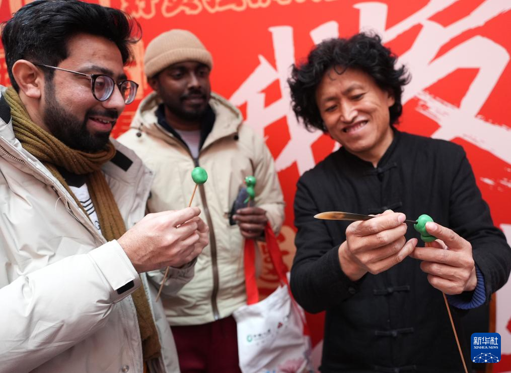 2月11日,在遼寧沈陽馬路灣街道,外國朋友獲贈糖人禮物。