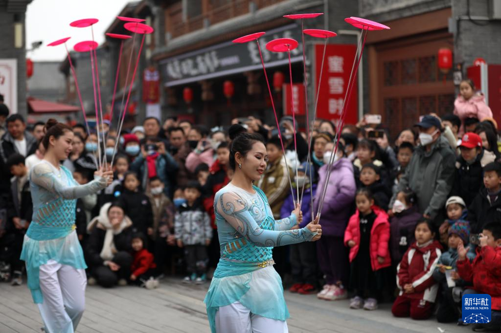 2月11日,在河北省滄州市運河區(qū)南川老街景區(qū),民間藝人為游客表演雜技節(jié)目《轉花碟》。