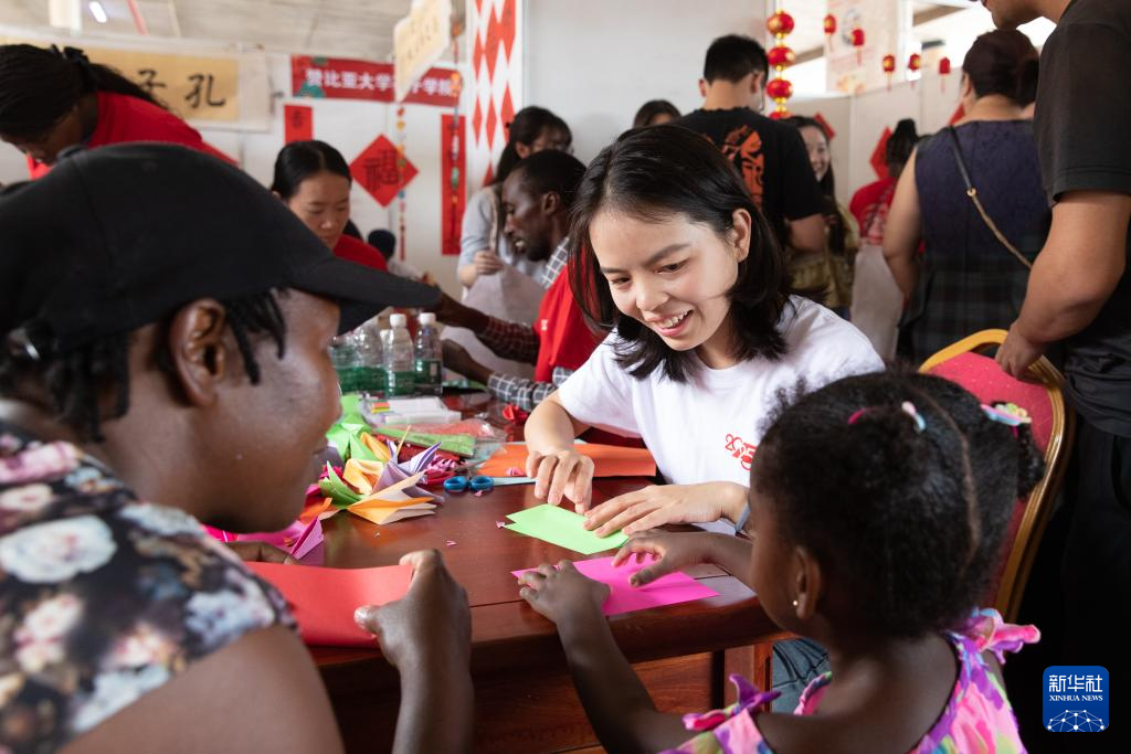 在廟會現(xiàn)場的贊比亞孔子學(xué)院展位前,人頭攢動。包括書法體驗、剪紙、折紙展示和猜字謎等豐富的文化互動項目,吸引人們紛紛參與體驗。一位贊比亞媽媽帶著孩子在老師指導(dǎo)下完成她的第一個中國結(jié)作品,她高興地說:“原來中國藝術(shù)這么有趣!希望我的孩子有一天可以去孔子學(xué)院學(xué)習(xí)?!?/p>
