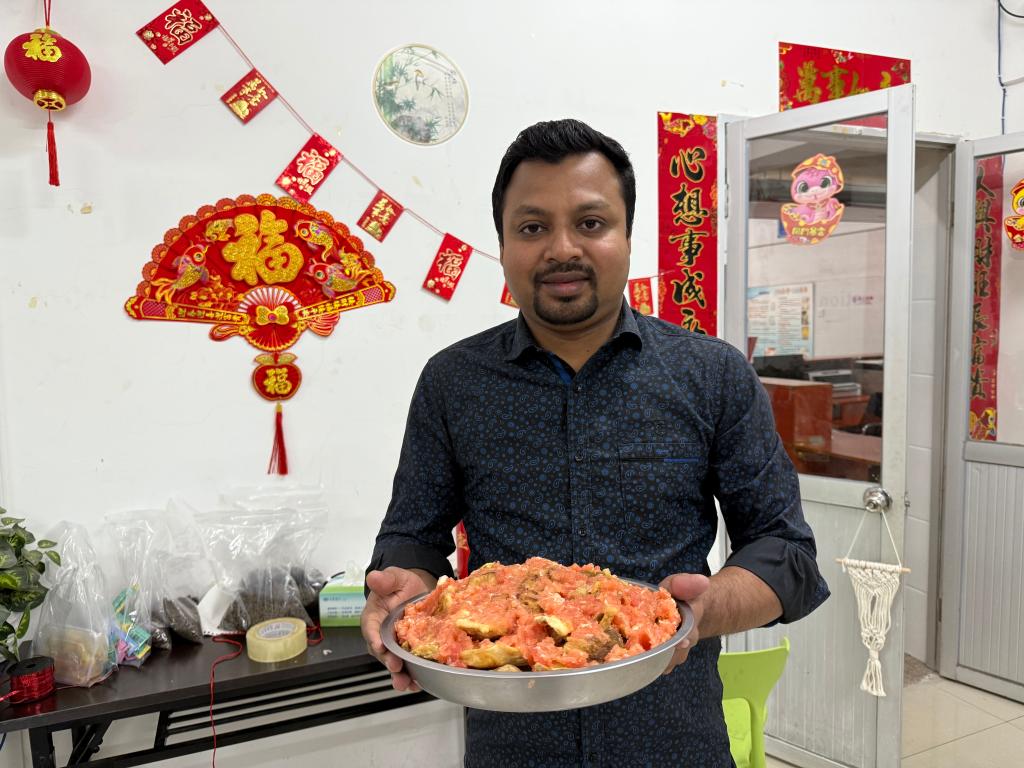 除夕年夜飯,孟加拉國(guó)青年吳迪正端著一大盤炸魚(1月29日攝)。新華社發(fā)