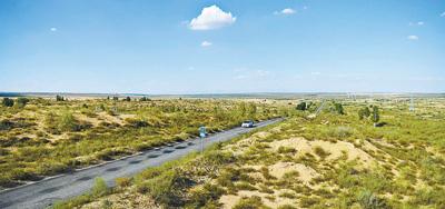 登上杭錦旗第一條穿沙公路旁的防火瞭望塔,四下遠望,只見公路兩側(cè)的沙地,被沙生植物覆蓋起來。這條全長115公里的黑色柏油路,從杭錦旗錫尼鎮(zhèn)出發(fā),猶如一把利劍,直插庫布其沙漠腹地,硬生生將沙漠?dāng)r腰劈斷。