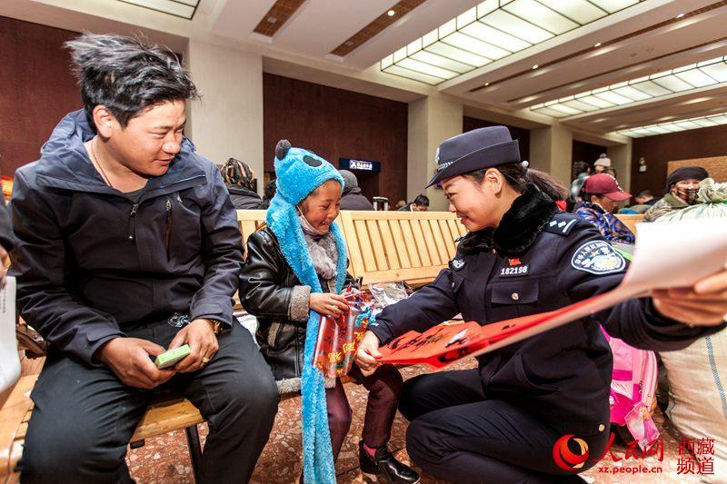 按照“平安出行、有序出行、溫馨出行”工作目標,拉薩鐵路公安處組織全處各單位干部民警共計60余人分別在西藏各火車站,緊緊圍繞“服務(wù)旅客為宗旨,待旅客如親人”的理念,開展了春運首日暨“一路溫馨一路情 天路鐵警伴您行”主題系列活動。圖為拉薩鐵路公安處民警(右一)向“小旅客”發(fā)放春聯(lián)。圖片來源:人民網(wǎng)