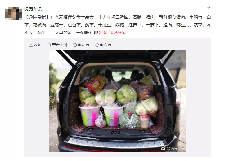 昨日,游子們從家這個(gè)港灣里,鳴笛啟航,奔向遠(yuǎn)方。除了對(duì)鄉(xiāng)愁的百轉(zhuǎn)千回,更有親情的濃郁化不開。這幾天,網(wǎng)友們都在微博里曬圖,“媽媽給裝的后備箱”的話題,一時(shí)成了熱點(diǎn)——“親手做的馬蹄糕”“最愛的家鄉(xiāng)小柚柑”“一大罐子土榨花生油”“秋天腌的糖蒜”……后備箱被爸媽塞得滿滿的,不愿帶還不高興。于是乎,調(diào)皮的網(wǎng)友留言:“明年我開個(gè)貨車回來(lái)過年!”