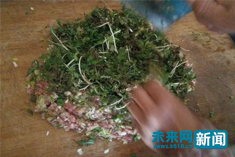 母女二人不僅開開心心地挖到了地菜,楊媽媽還真的用地菜包了一頓餃子,搟了一次手工面,把地菜全部盛到女兒碗里。