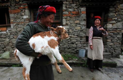 次仁央宗(右)是“薩瑪酒歌”的傳承人,這項門巴族的傳統(tǒng)藝術已經成為國家級非物質文化遺產。現(xiàn)在她正在村里修建灌渠的施工隊里打短工,一天可以掙一百元,此時被村長叫回家接受了我們的采訪。(攝影/ 邱衍慶)
