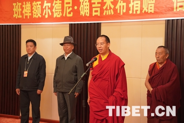 圖為十一世班禪在捐贈(zèng)儀式上講話。攝影:王淑