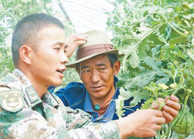 崗巴邊防營(yíng)官兵向當(dāng)?shù)剞r(nóng)牧民傳授蔬果種植技術(shù)。