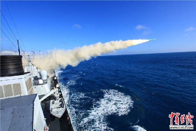 2008年11月8日,??谂炘谀澈S騾⒓訉?shí)彈演習(xí),圖為??谂灠l(fā)射反艦導(dǎo)彈。