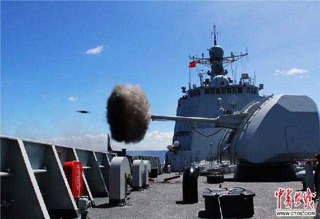 2014年6月19日,海口艦參加多國聯(lián)演任務(wù),圖為??谂炛髋谏鋼?。于林 攝