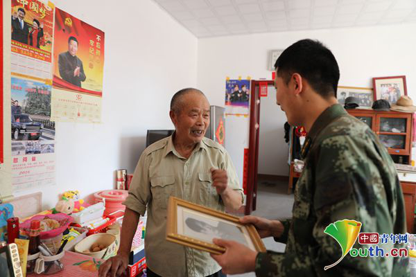孟曉暉的爺爺孟慶欣也曾經(jīng)是一名解放軍戰(zhàn)士,并榮獲過獨(dú)立獎(jiǎng)?wù)?。每?dāng)說起自己的從軍經(jīng)歷時(shí),這位年過八旬的老人都十分振奮,談到繼承了“紅色基因”的兒孫時(shí),孟慶欣老人的驕傲與自豪更是溢于言表。他說,自己經(jīng)常把當(dāng)年參軍的故事講給子孫聽,曉暉就是聽著爺爺?shù)墓适麻L大的,從小就說自己長大后也要當(dāng)兵。在唱起這首凝聚了他熱血青春與報(bào)國壯志的軍歌之前,老人嚴(yán)肅地說道:“我要換上一身整潔的軍裝!”