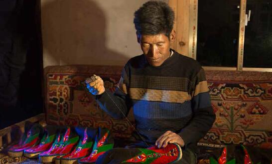 “孫瑪熱雜”的線多用來(lái)納鞋底。用“孫瑪熱雜”納出來(lái)了的鞋底結(jié)實(shí)耐穿,且經(jīng)水浸泡會(huì)越變?cè)接?,更結(jié)實(shí),深受農(nóng)牧民歡迎。幾厘米厚的鞋底需要用錐子扎一個(gè)穿,鞋底要納的密實(shí),旺堆手上老繭滿滿。