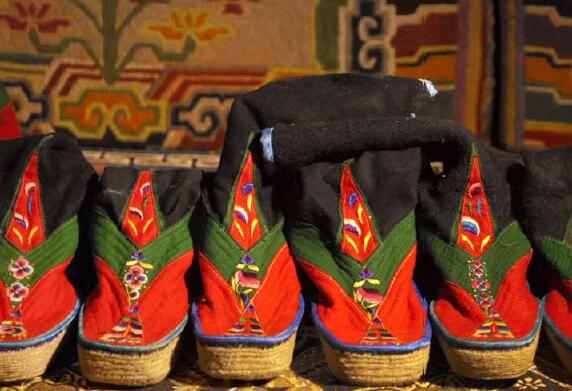 靴子大致也分三種:黑色平絨布和牛皮相間作腰的稱(chēng)為“熱瑪魯”;用絨布作筒的稱(chēng)作“布江”;鞋腰全部用皮料做的皮靴叫做“過(guò)瓦居爾達(dá)”。靴子的顏色以黑色居多,早期的具有典型的蒙古風(fēng)格。而“嘉慶”是藏鞋中的高檔品,藏語(yǔ)里是“虹影”的意思,鞋面及鞋腰上的兩組線條恰似美麗的彩虹,底子很厚,用優(yōu)質(zhì)毛氈疊加,保暖結(jié)實(shí)。目前售價(jià)在九百元以上的“嘉慶”鞋過(guò)去多為上層官員專(zhuān)用。