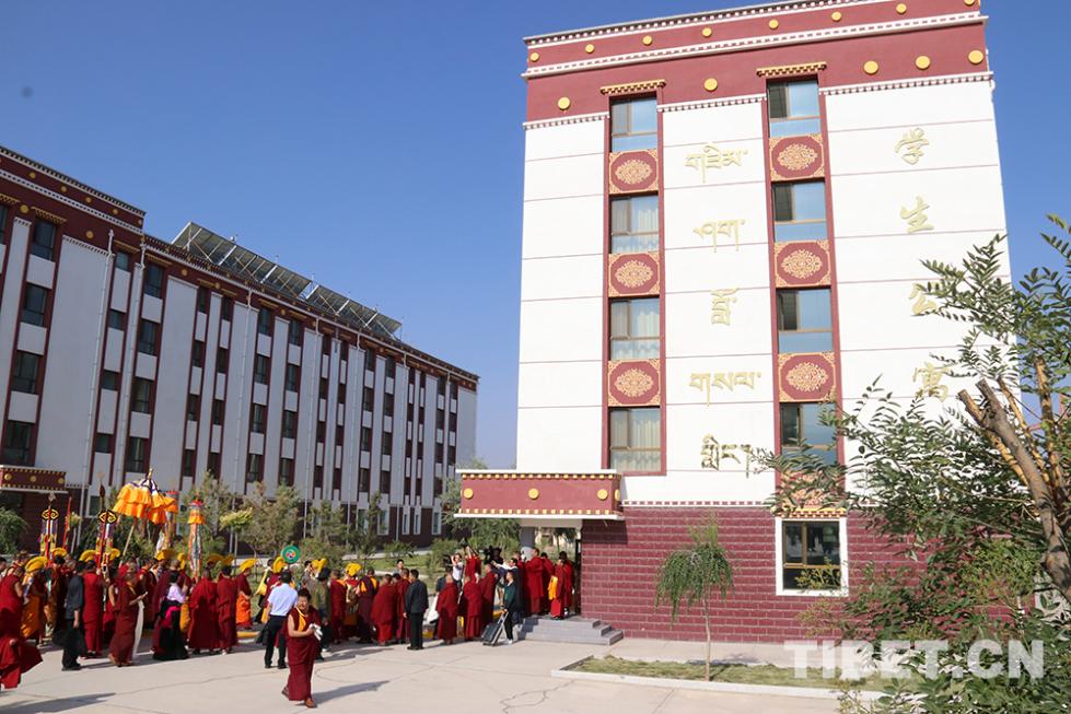 班禪大師此次前往位于貴德縣珍珠寺對(duì)面的青海省藏語(yǔ)系佛學(xué)院考察。青海省藏語(yǔ)系佛學(xué)院是由十世班禪大師倡議,1984年3月經(jīng)省人民政府批準(zhǔn),1986年9月在佛教圣地塔爾寺創(chuàng)辦的培養(yǎng)愛(ài)國(guó)愛(ài)教藏傳佛教高素質(zhì)僧才的地方性宗教院校,是藏傳佛教新的學(xué)銜制度具體實(shí)施單位和“智然巴”、“禪然巴”中級(jí)學(xué)銜和初級(jí)學(xué)銜授予單位。2014年國(guó)家投資1.16億元在海南州貴德縣新建佛學(xué)院,2016年3月交付使用,新學(xué)院建有教學(xué)與辦公一體的綜合樓、教職工公寓、學(xué)員宿舍、經(jīng)堂、佛塔、餐廳、風(fēng)雨操場(chǎng)等設(shè)施,水電暖網(wǎng)等設(shè)備齊全。