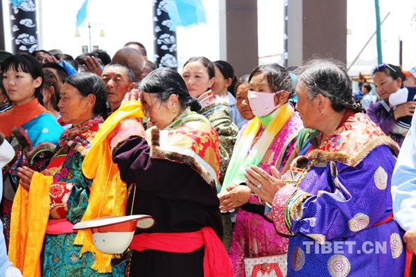 海西州的蒙古族藏族信眾們身著節(jié)日盛裝早早迎候在潔白的鹽湖旁,草原夏日的微風(fēng)吹過,藍(lán)色的哈達(dá)、經(jīng)幡和錦緞盛裝隨風(fēng)舞動??吹绞皇腊喽U到來,人們興奮地高呼“烏拉!烏拉!”這是用來表示歡迎和興奮的歡呼聲,眾人一起高呼,響徹云霄。十一世班禪為這些海西州的蒙藏信教群眾一一摩頂祈福。(中國西藏網(wǎng) 文、圖/噶哇扎西)