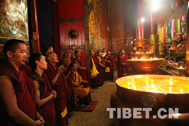 班禪還到扎什倫布寺大藏經(jīng)堂、漢佛堂、強巴佛殿等佛殿和經(jīng)堂,和各殿堂僧人一起念經(jīng)祈禱。每到一處佛殿,班禪與陪同高僧一道領誦經(jīng)文、拋灑青稞,祈愿五谷豐登、六畜興旺、國泰民安。攝影:王淑。