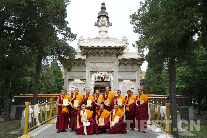 圖為中國(guó)藏語(yǔ)系高級(jí)佛學(xué)院第十四屆格魯派“拓然巴”學(xué)銜獲得者在西黃寺清凈化城塔前合影留念。后排右三為本文作者日巴。