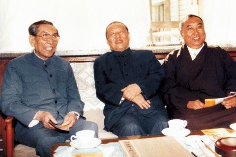 圖為1986年4月,習(xí)仲勛(中)與十世班禪(右)、阿沛o阿旺晉美(左)在一起。圖片來源:新華網(wǎng)