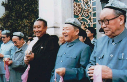 圖為習(xí)仲勛(左一)、十世班禪(中)、鄧穎超(右一)、參加中國藏語系高級佛學(xué)院成立大會(huì)。圖片來源:人民日報(bào)