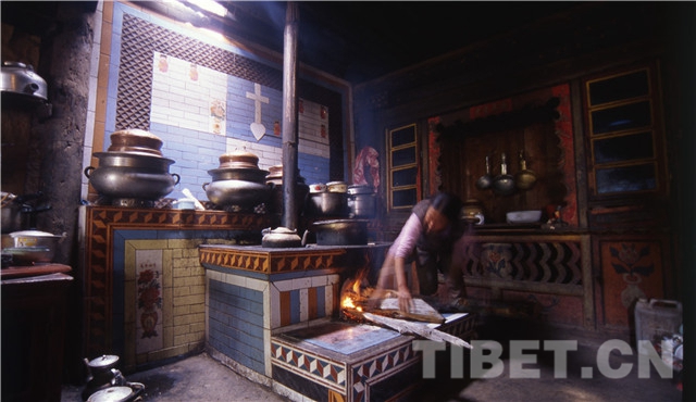 坐在阿妮家的火塘前,看著她進(jìn)進(jìn)出出忙著做午飯?;鹛琳惺谴纱u鑲成的十字架,對于習(xí)慣了將佛像和藏族人聯(lián)系在一起的我們,這多少有些不同尋常。